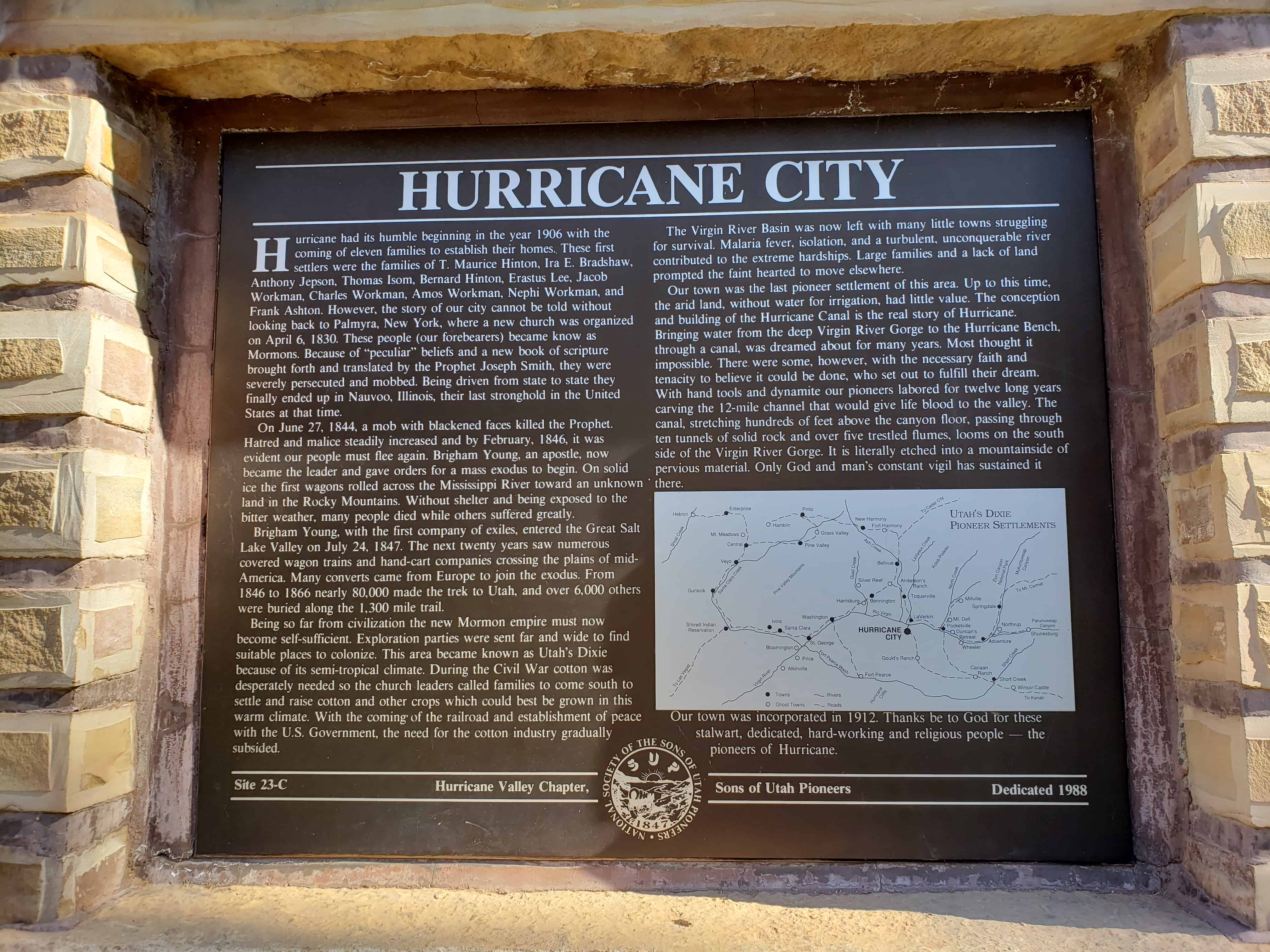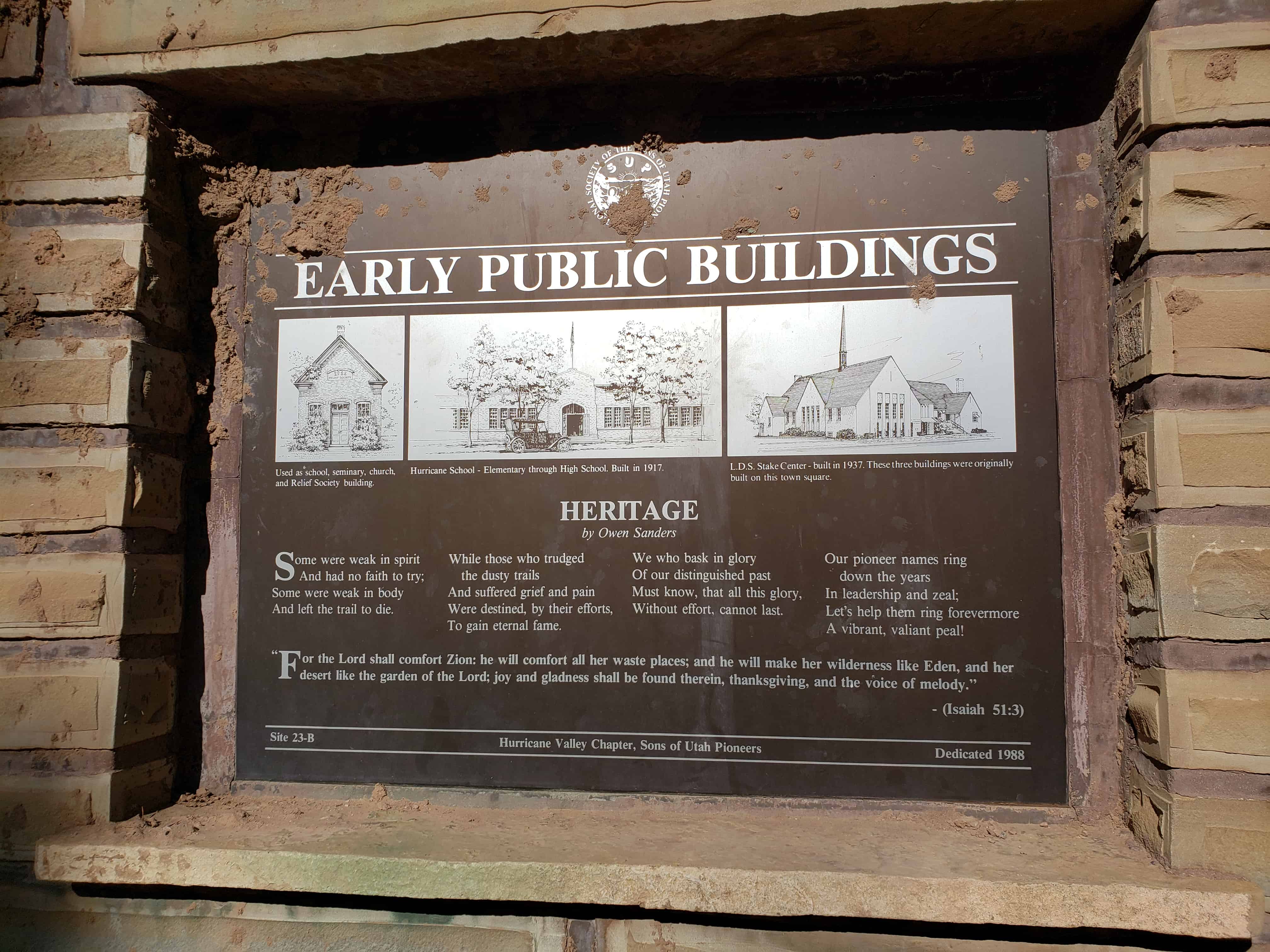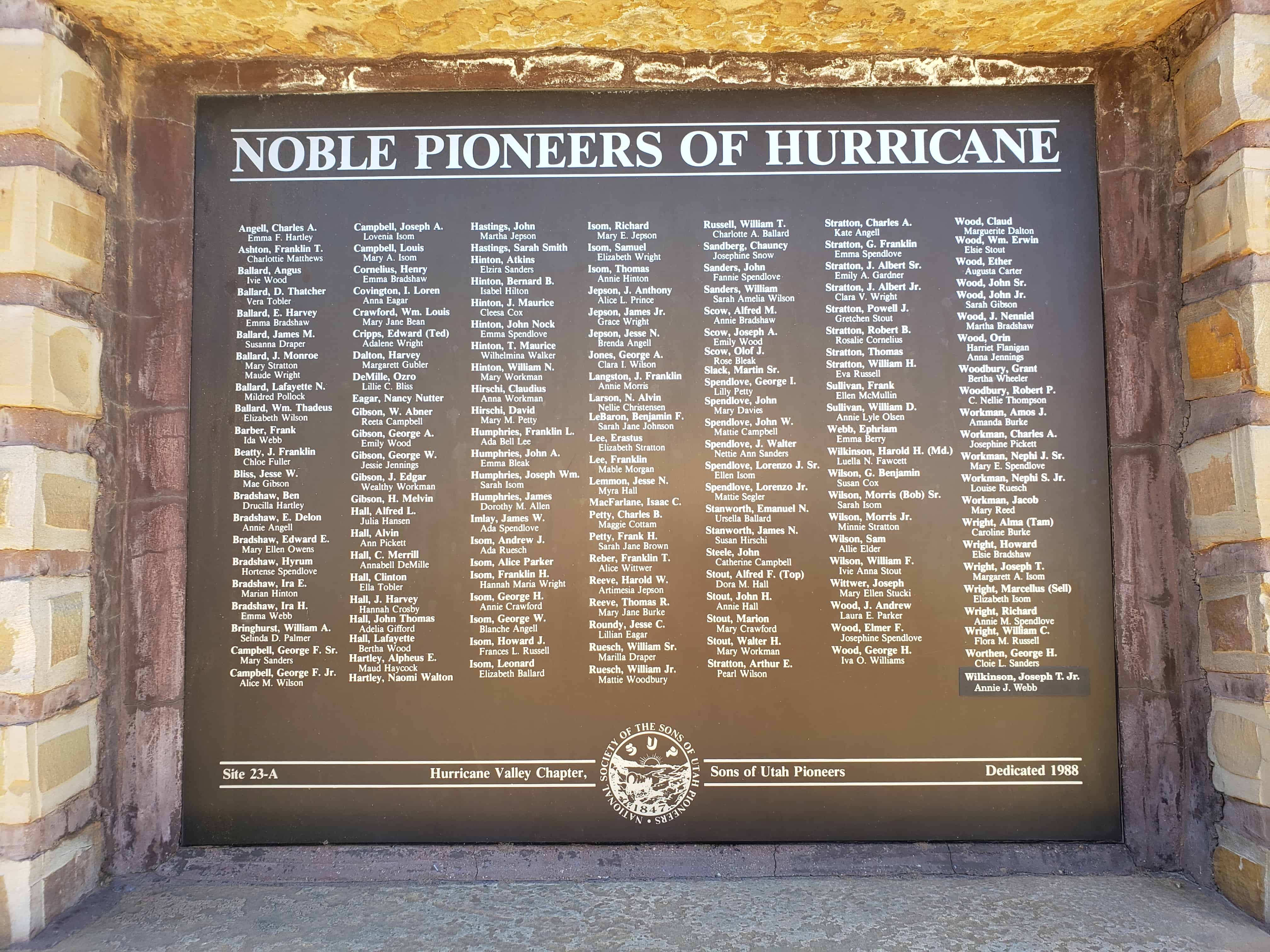 | 23-A | Noble Pioneers of Hurricane | Hurricane, Washington, Utah | Distant Close up | N 37.17624 W 113.28852 |