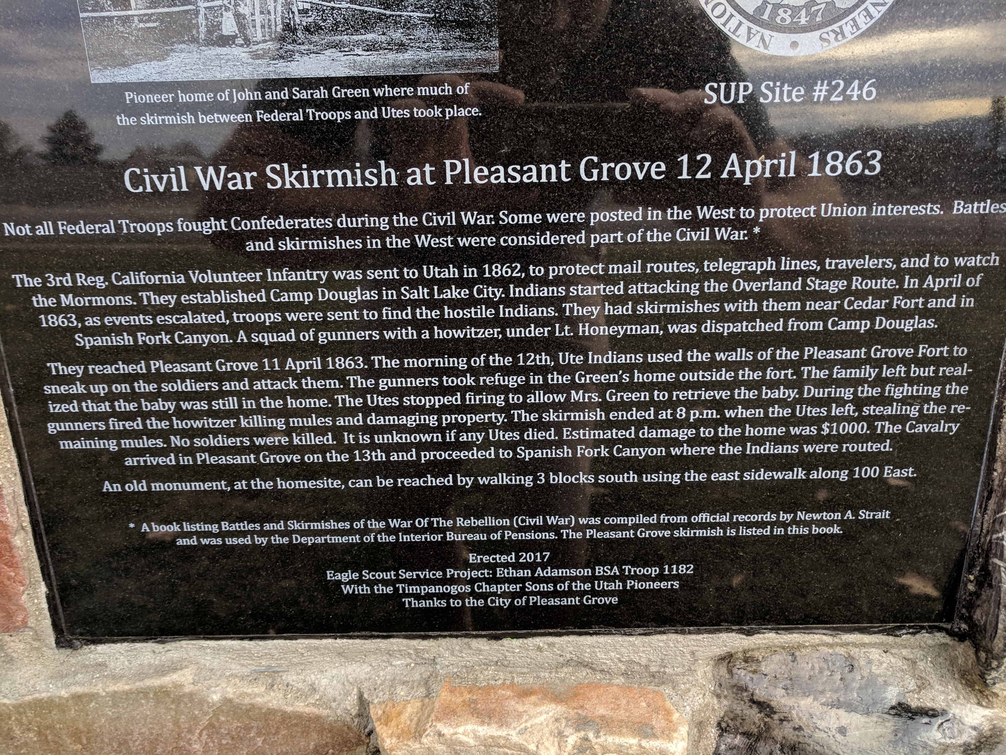 | UPTLA #110 | Providence Pioneers | Providence, Cache, Utah | Distant Close up | N 41.70778 W 111.81751 |