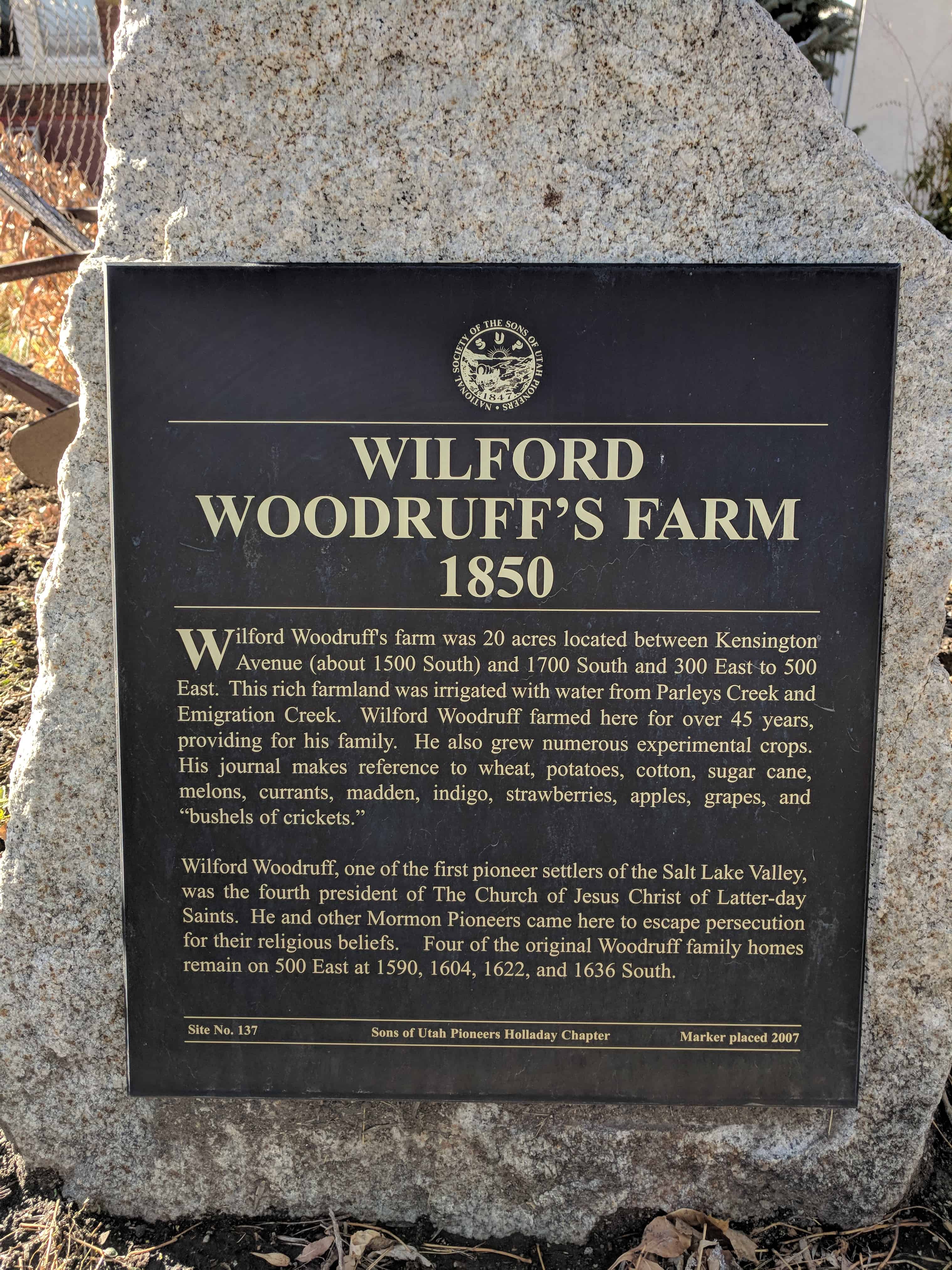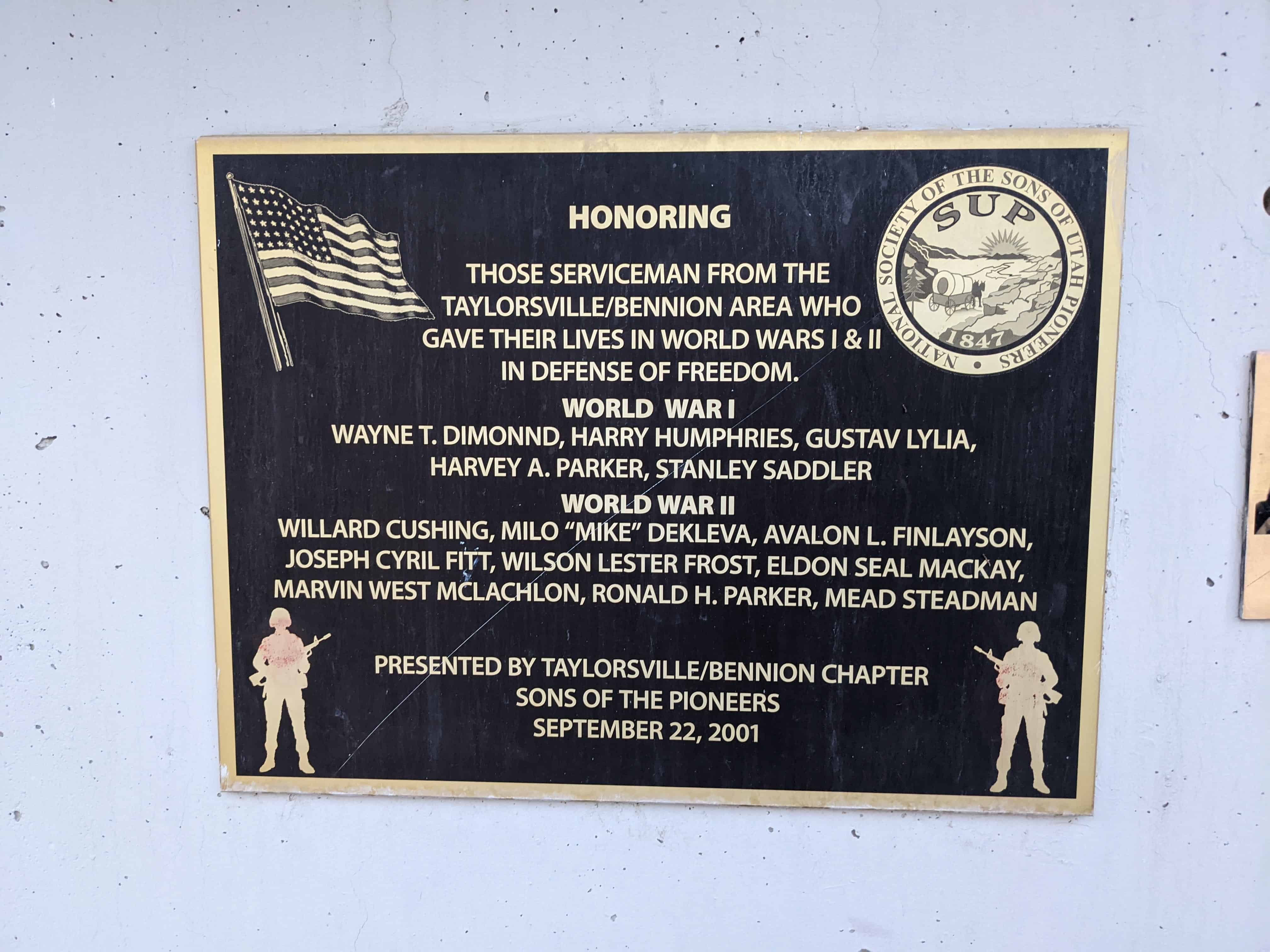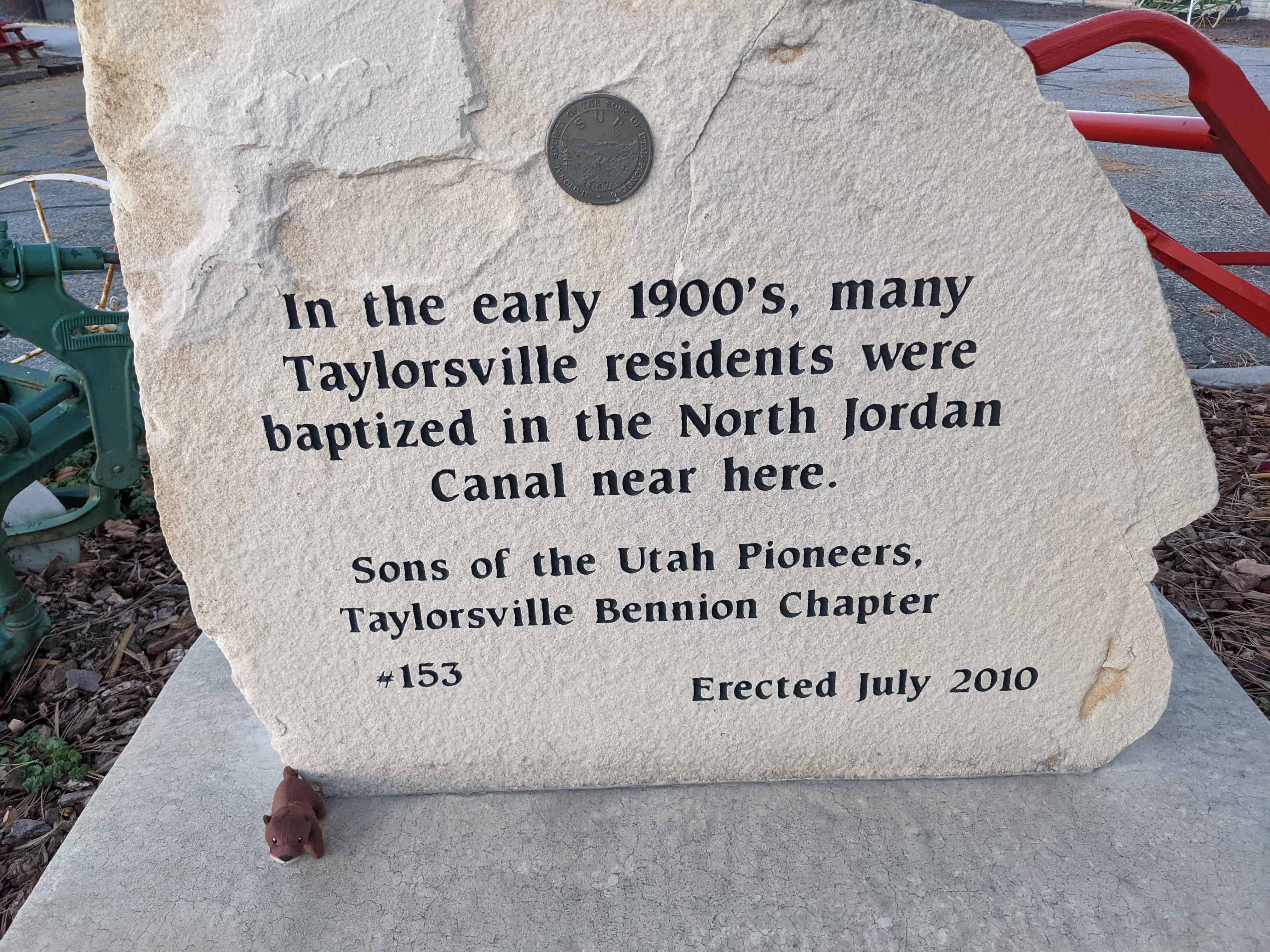 | 13 | Tribute to Taylorsville-Bennion Pioneers | Taylorsville, Salt Lake, Utah | Distant Close up | N 40.66347 W 111.93015 |