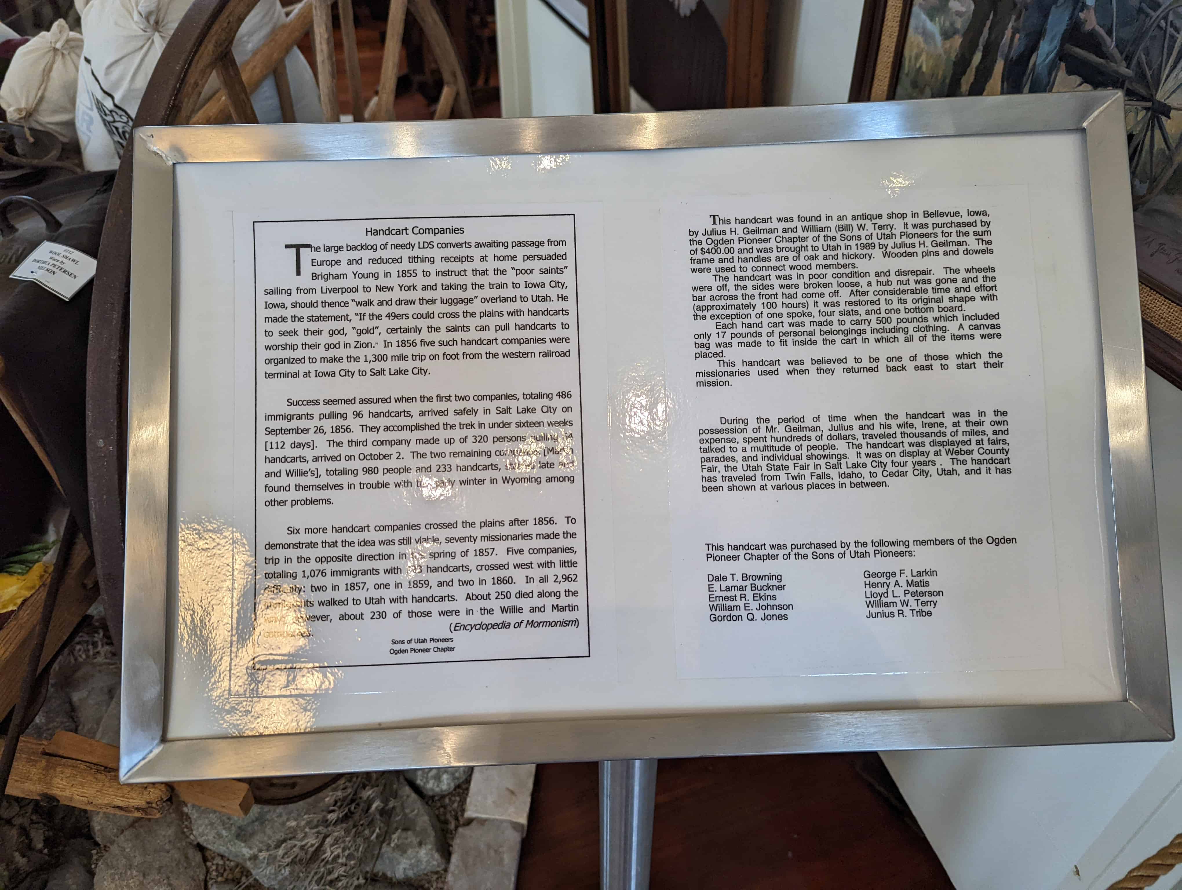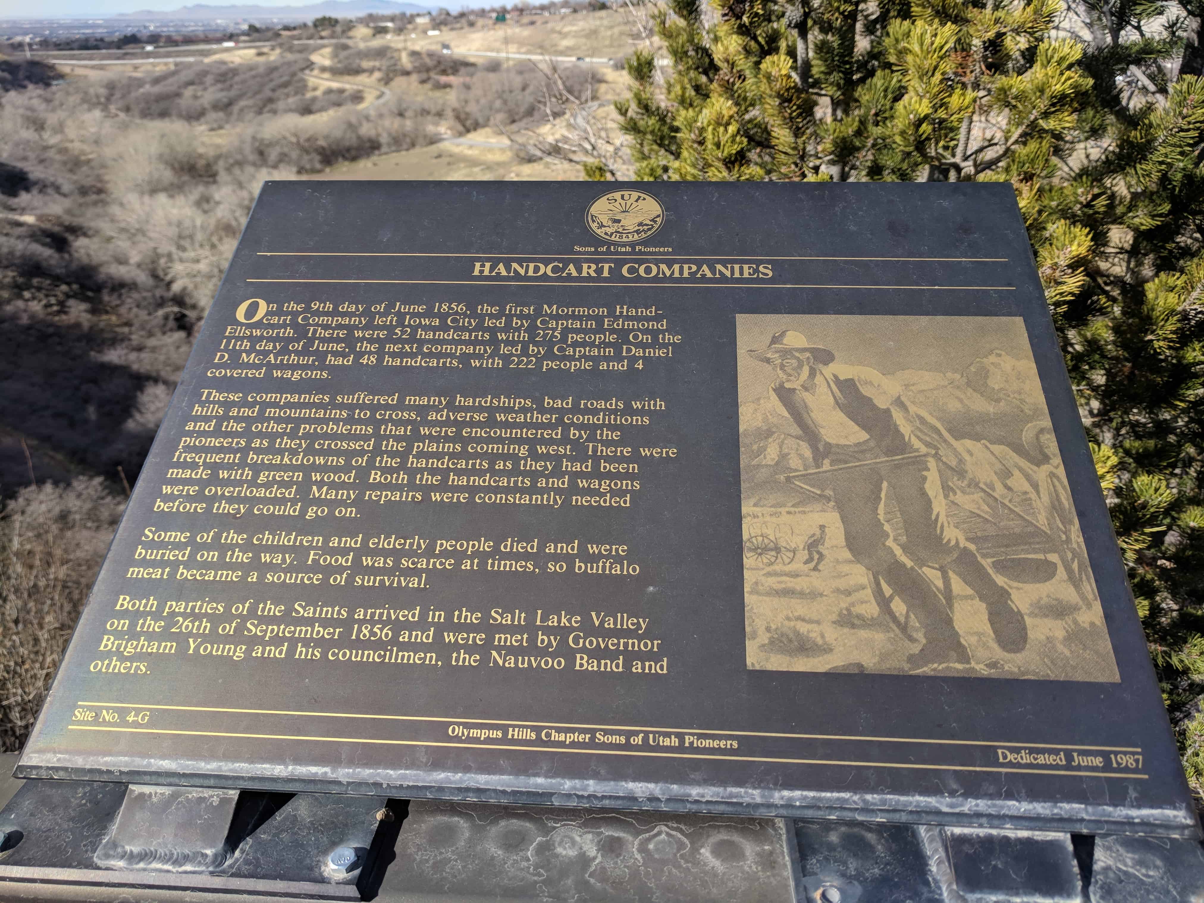 | 4-G | Handcart Companies | Salt Lake City, Salt Lake, Utah | Distant Close up | N 40.70854 W 111.80200 |