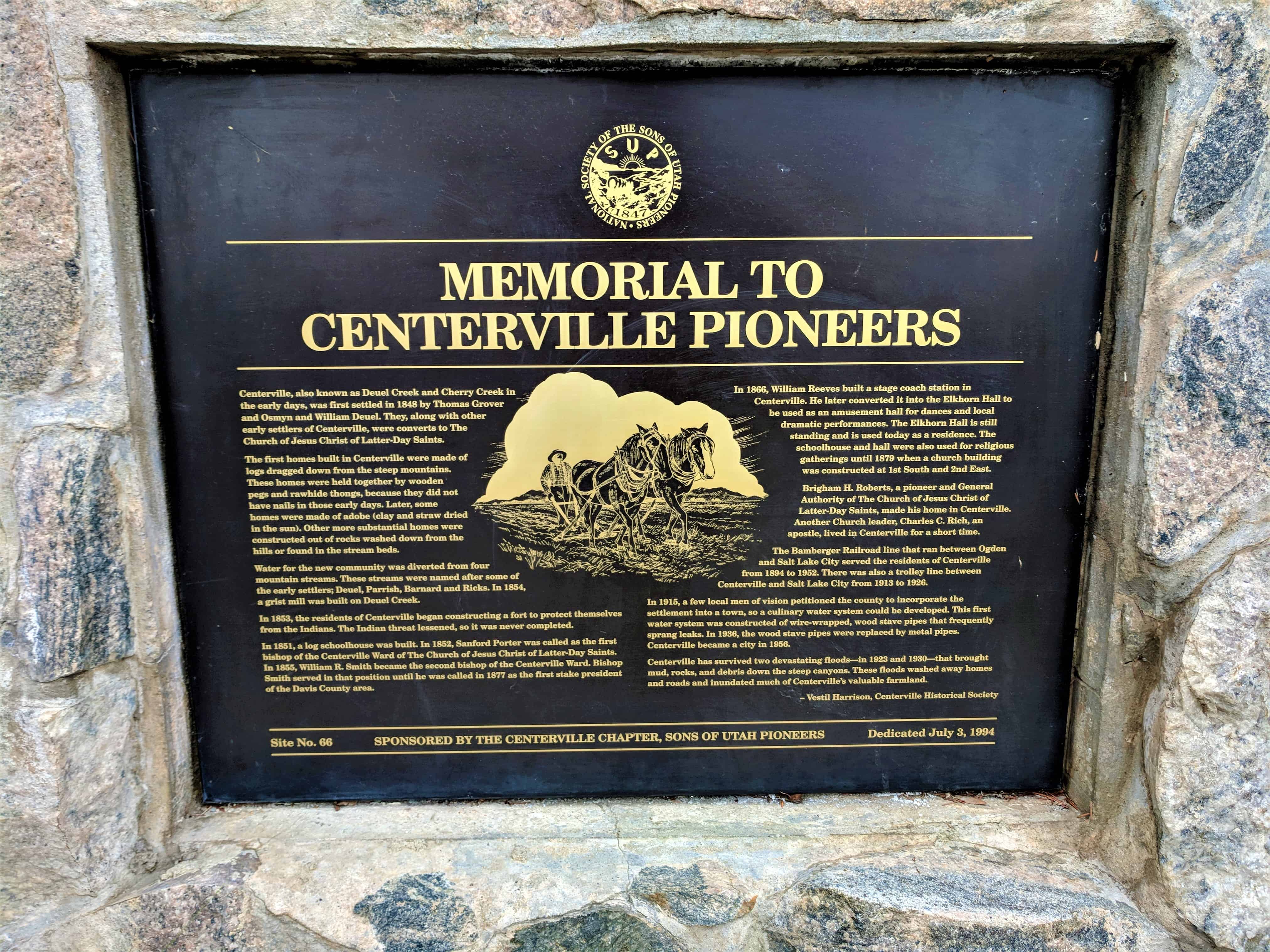 | 66 | Memorial to Centerville Pioneers | Centerville, Davis, Utah | Distant Close up | N 40.92033 W 111.87872 |