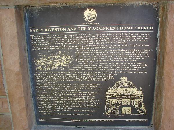 | 7 | Early Riverton and the Magnificent Dome Church | Riverton, Salt Lake, Utah | Distant Close up | N 40.51965 W 111.93351 |