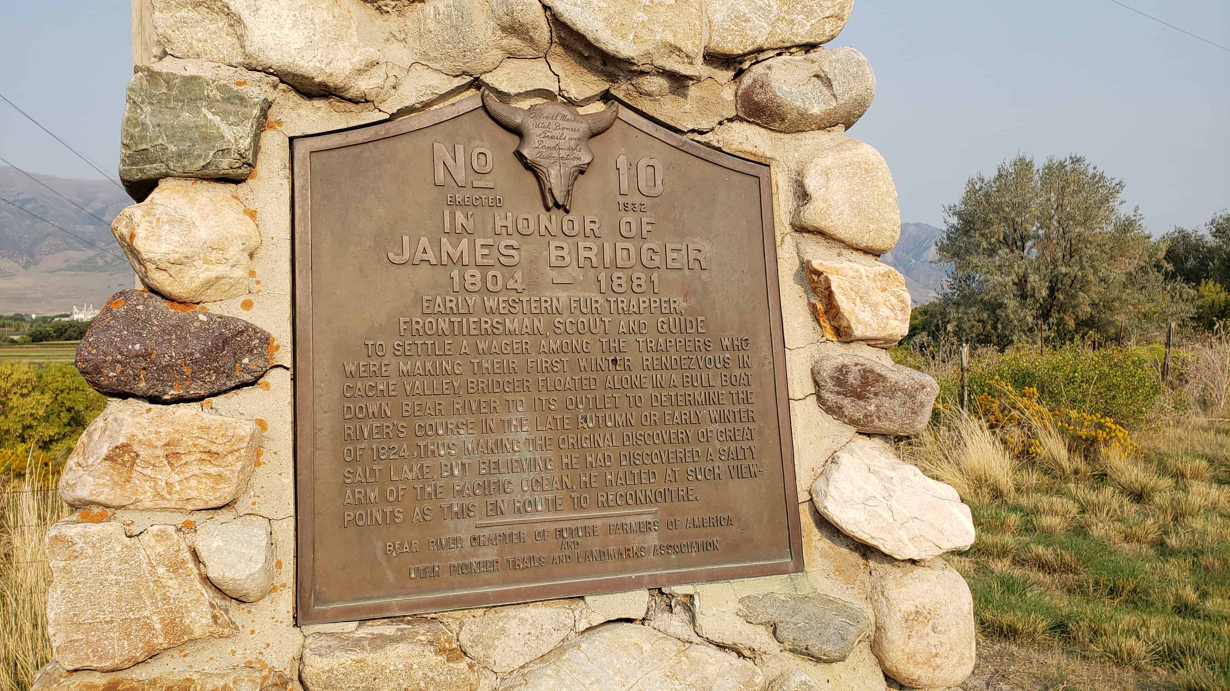 | UPTLA #10 | In Honor of James Bridger | Bear River, Box Elder, Utah | Distant Close up | N 41.63548 W 112.12820 |
