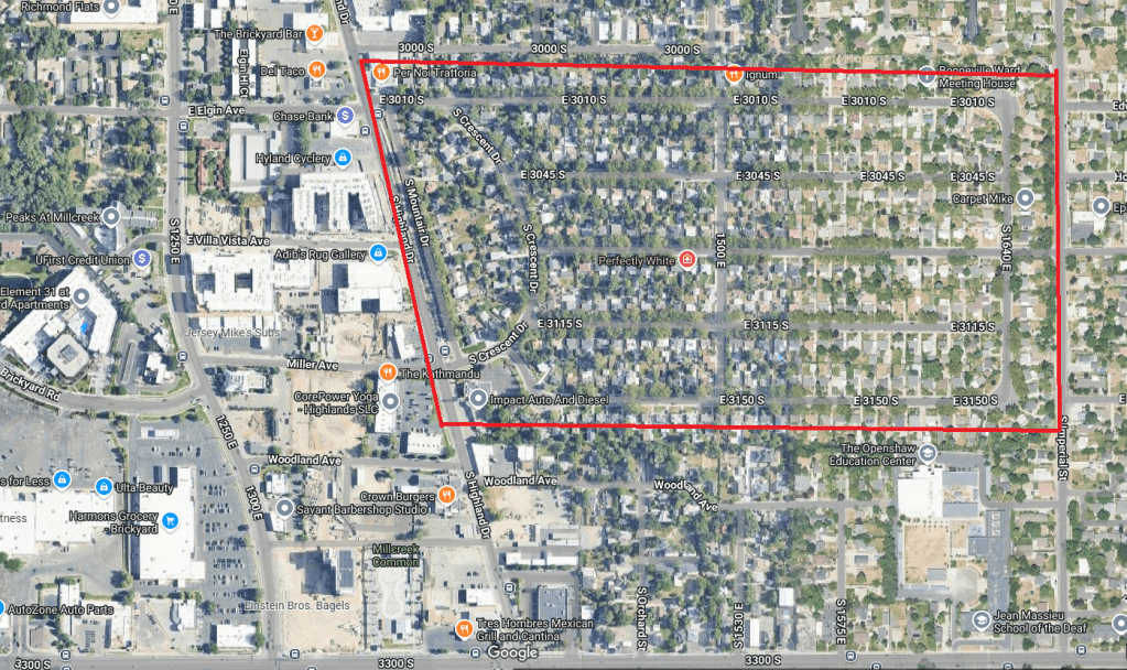 The Mountair Acres Subdivision Historic District (hereafter referred to as Mountair Acres) is one of Millcreek’s earliest subdivisions, composed of approximately 75 acres along Highland Drive, a major commercial corridor between Salt Lake City and Millcreek. While the neighborhood started as a rural area, it was acquired and mined for its high natural clay content by the Salt Lake Pressed Brick Co. The subdivision was first platted in 1939 with construction starting in 1940. Several model homes were available for viewing, including a collaboration with Montgomery Ward. Over the next nine years, the subdivision was platted and construction completed in 1952 with all lots built and sold. Design of Mountair Acres added the flair of a curved street, Crescent Drive, as a key focal and circulation point that set it apart from traditional grid subdivisions. Use within Mountair Acres is completely single-family residential. Character-defining features of the district include uniform setbacks, landscaping with mature trees in the park strip, grass lawns, rear garages, and one story buildings. There are a total of 709 resources in the Mountair Acres Subdivision Historic District with three architectural styles within the period of significance (1940-1959). Contributing buildings number 523 (74%), while there are 186 (26%) non-contributing resources, including one (<1%) non-contributing site. The 709 resources break down to 374 (53%) primary resources and 334 (47%) secondary resources. Within the category of primary buildings, the integrity numbers remain strong with 307 (82%) contributing and 67 (18%) non-contributing. Despite limited square footage and location near Salt Lake City, the neighborhood has not been a target for teardowns for larger houses to the present date which has led to a high degree of retained integrity in all seven areas.