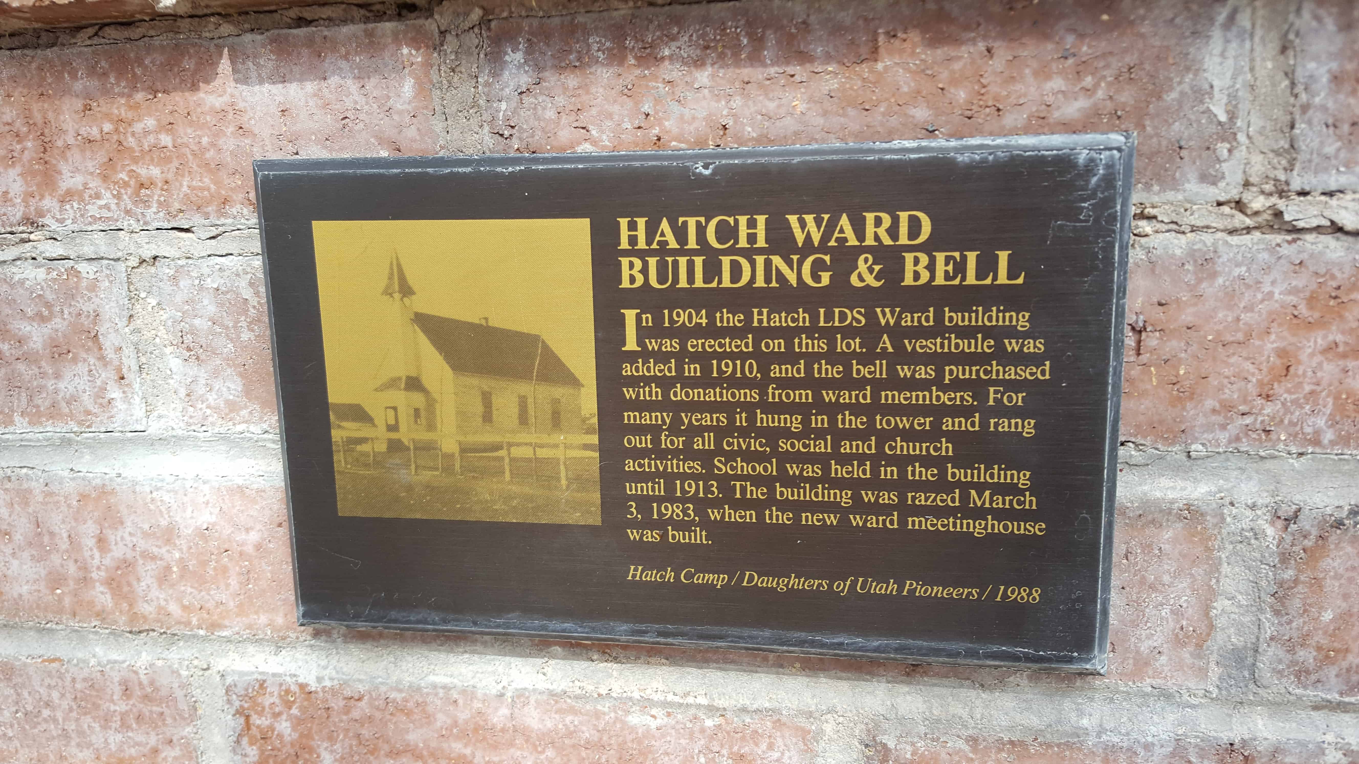 | Hatch Ward Building & Bell | 24 South Main St | Hatch | Garfield, Utah | Distant Close up | N 37.64913 W112.43465 | |