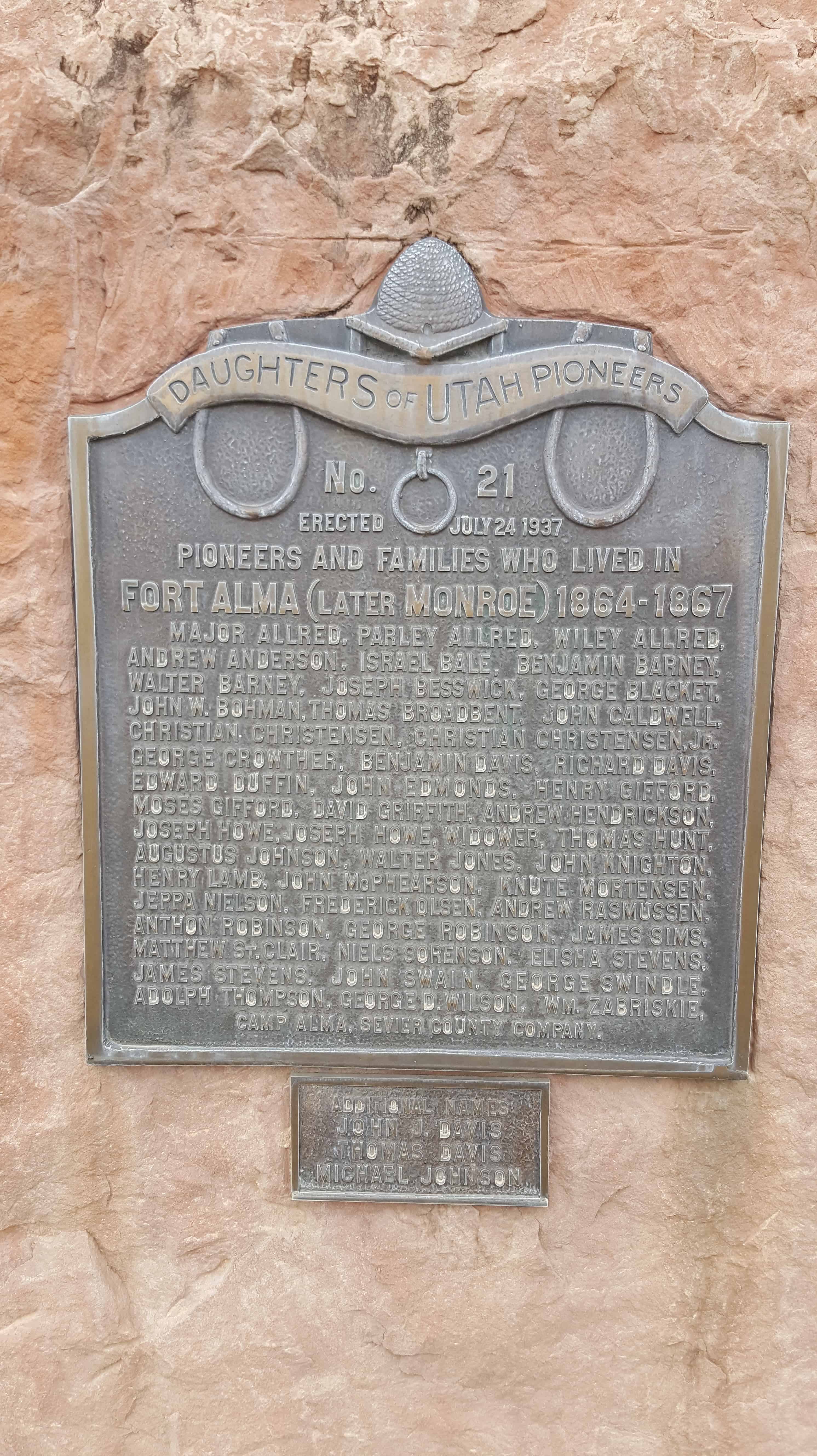| 21 | Fort Alma | 205 N 100 W | Monroe | Sevier, Utah | Distant Close up | N 38.63557 W 112.12373 |