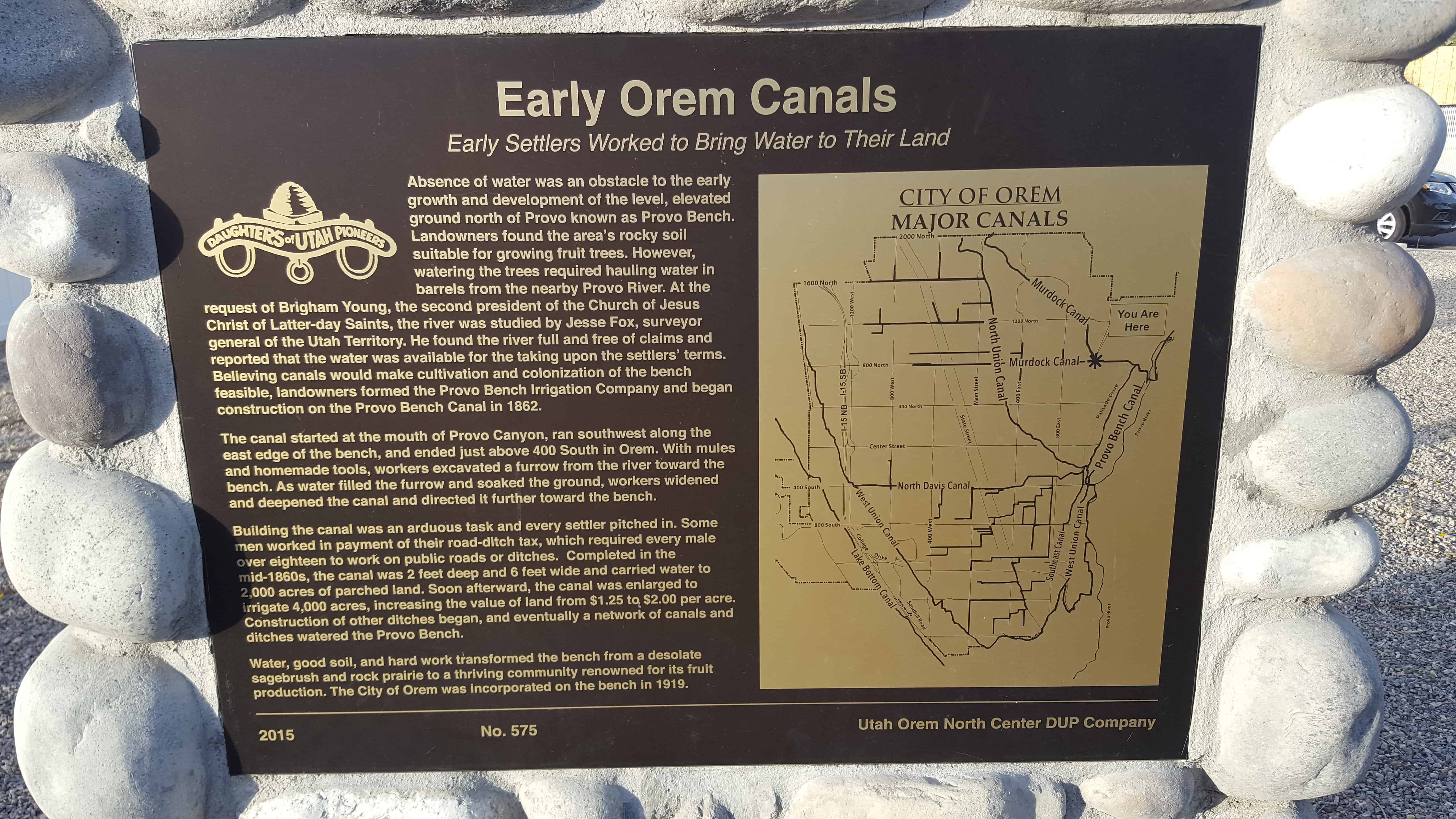 | 575 | Early Orem Canals | 1100 E 800 N | Orem | Utah, Utah | Distant Close up | N 40.31233 W 111.66980 |