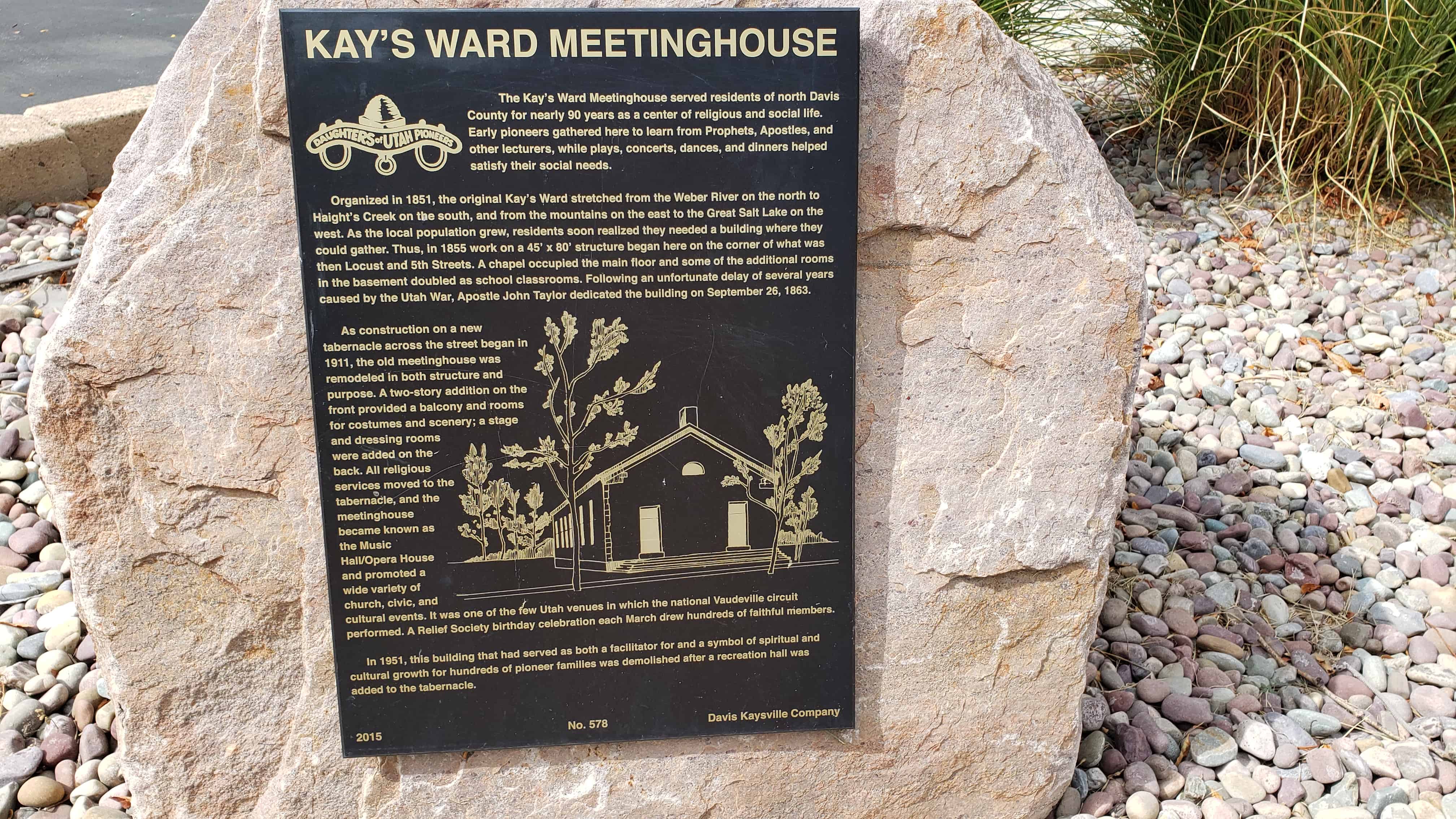 | 578 | Kay’s Ward Meetinghouse | 202 W Center St | Kaysville | Davis, Utah | Distant Close up | N 41.03498 W 111.94215 |