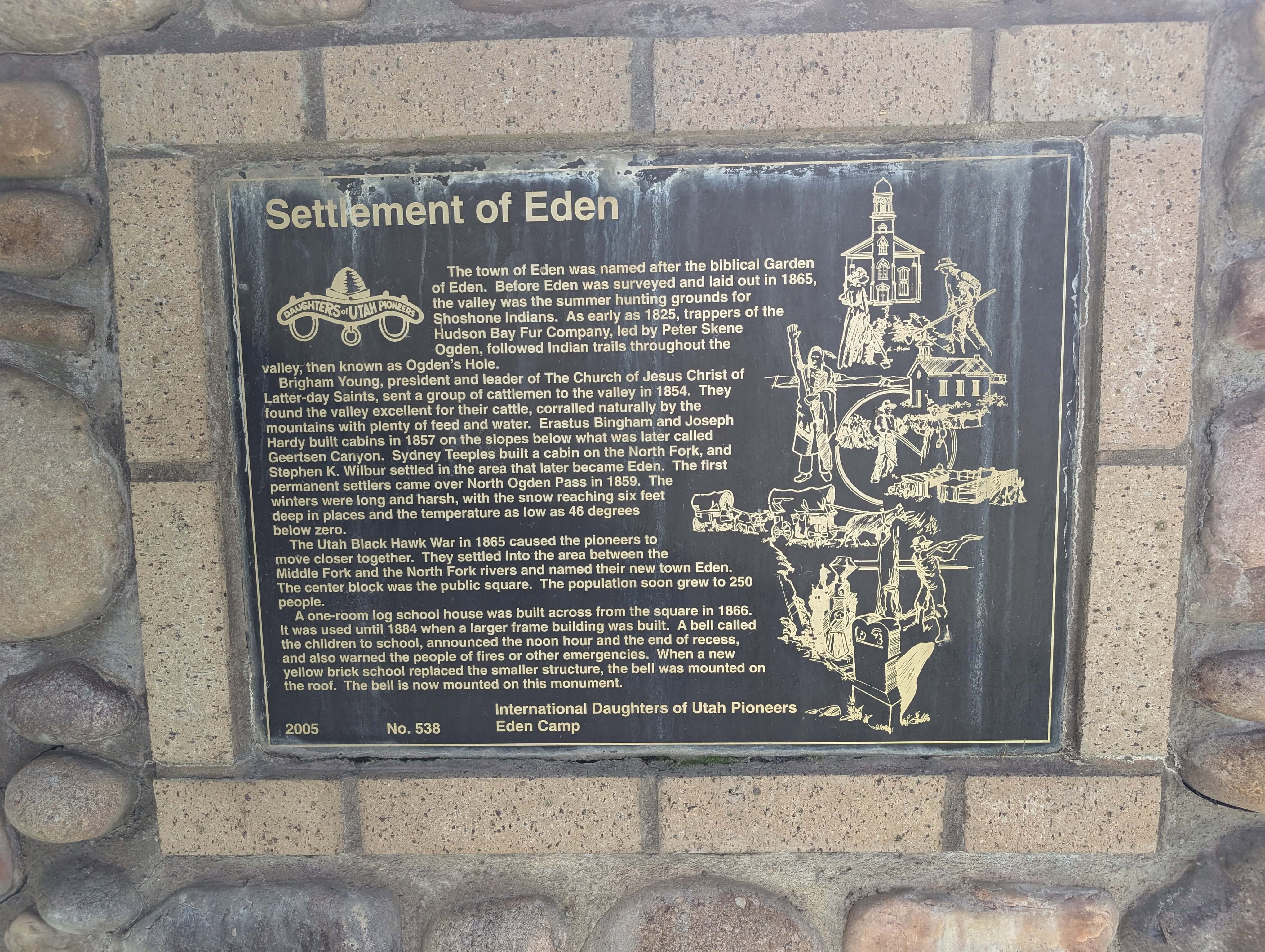 | 538 | Settlement of Eden | 5509 East 2200 North | Eden | Weber, Utah | Distant Close up | N 41.29869 W 111.81511 |