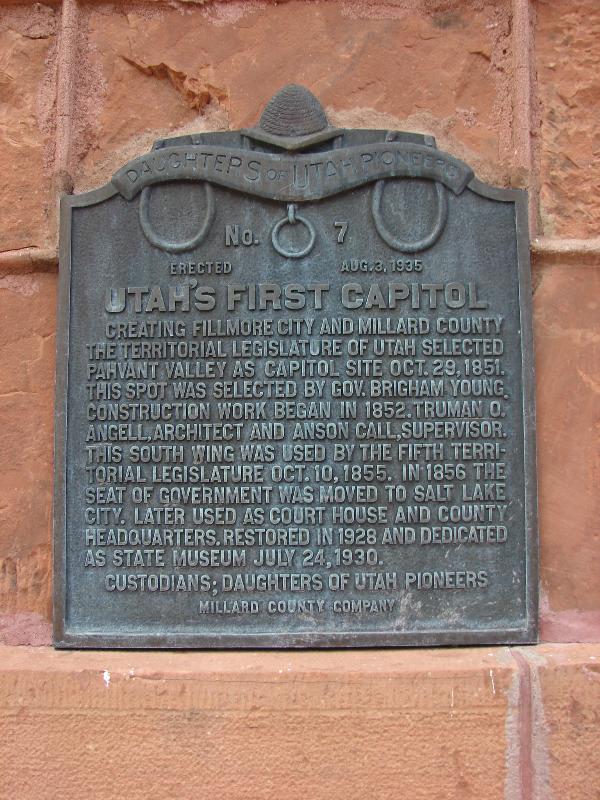 | 7 | Utah's First Capitol | 50 West Capitol St | Fillmore | Millard, Utah | Distant Close up | N 38.96756 W 112.32508 |