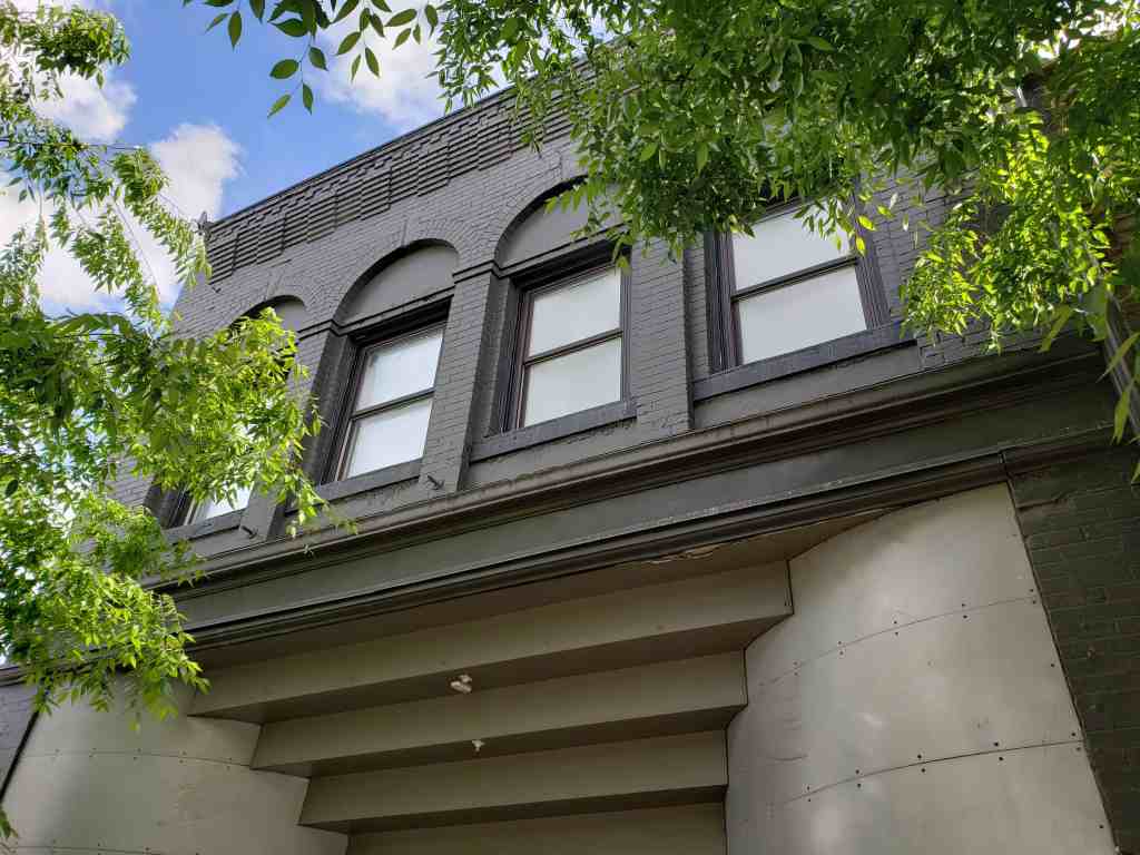 This is a commercial structure of rectangular plan and two-stories. The street level has been re-sided with narrow vertical boards to enclose what was originally probably glazed in the area now enclosed by the end pilasters and lower cornice. Four round arched openings create an arcade at the second story level containing the double hung windows at this story. Pronounced keystones and sills are part of the scheme. A continuous molded string course which spans the arcade horizontally at the level of the springers of the arches is another element of the arcading scheme. This string course helps form the pilaster motif of the arcading. A wide corbelled brick cornice includes dentilation and dogtoothing.