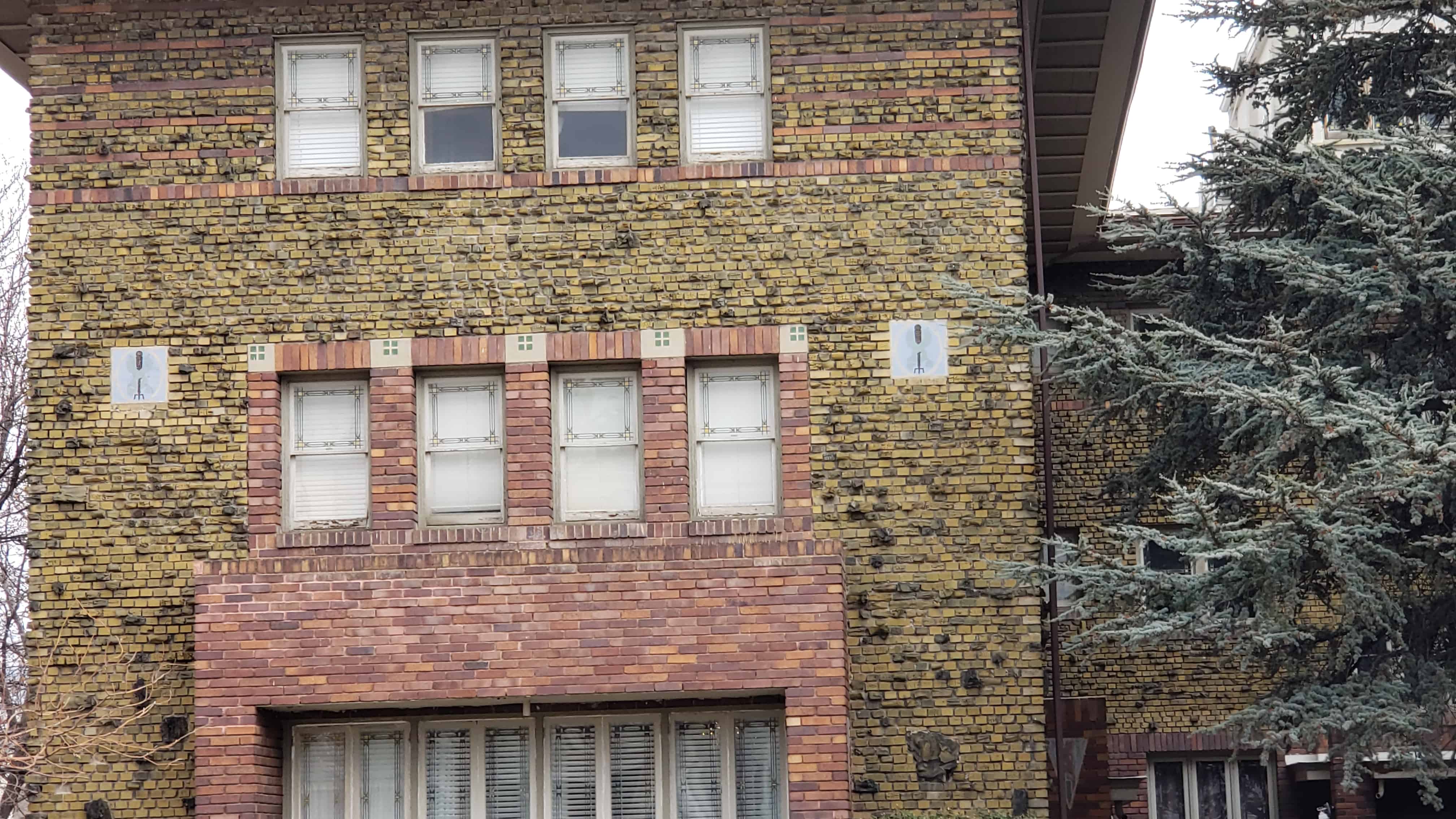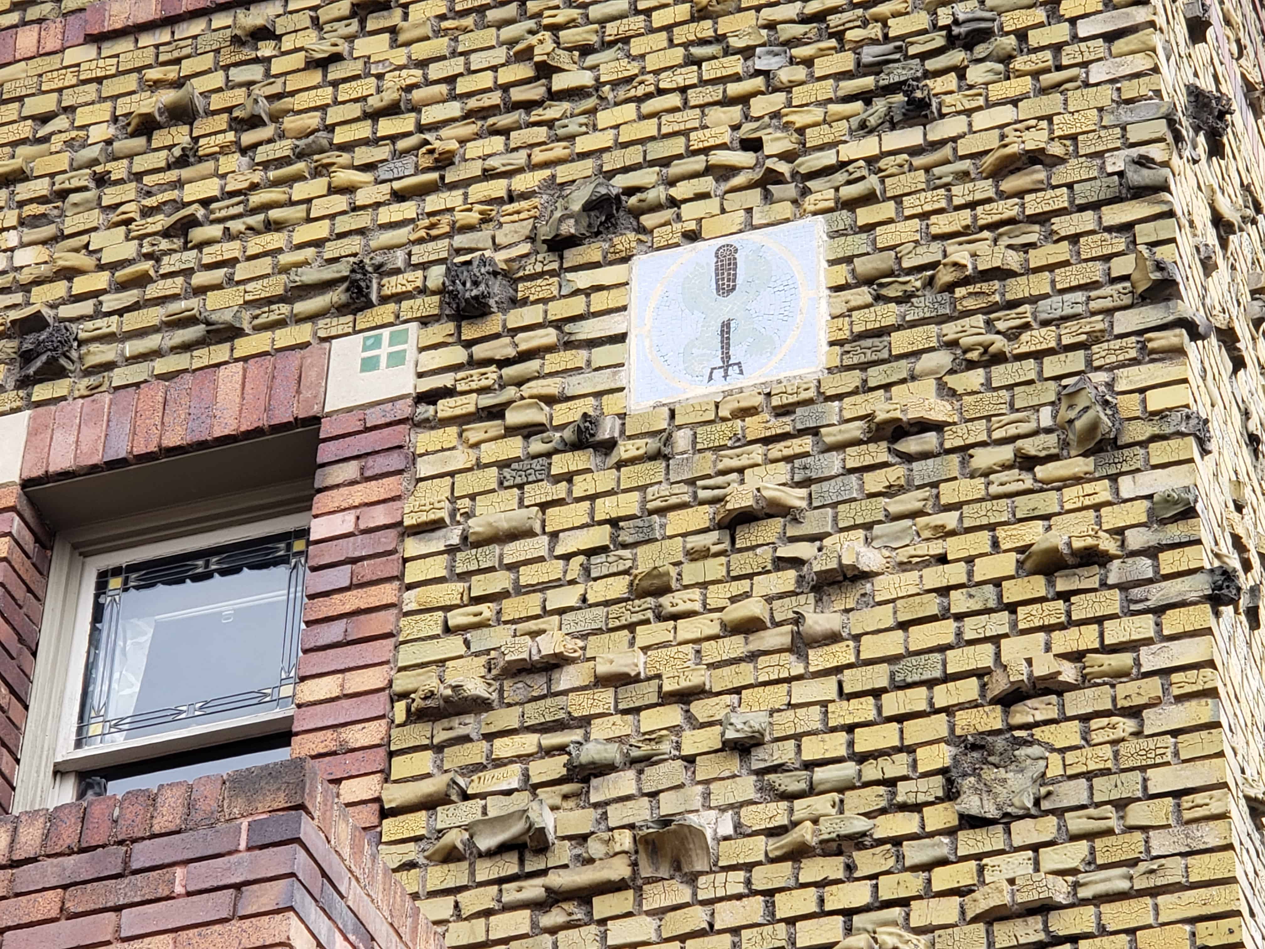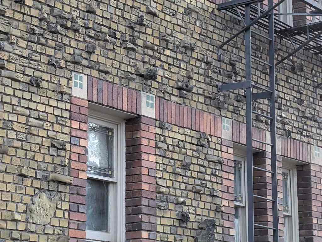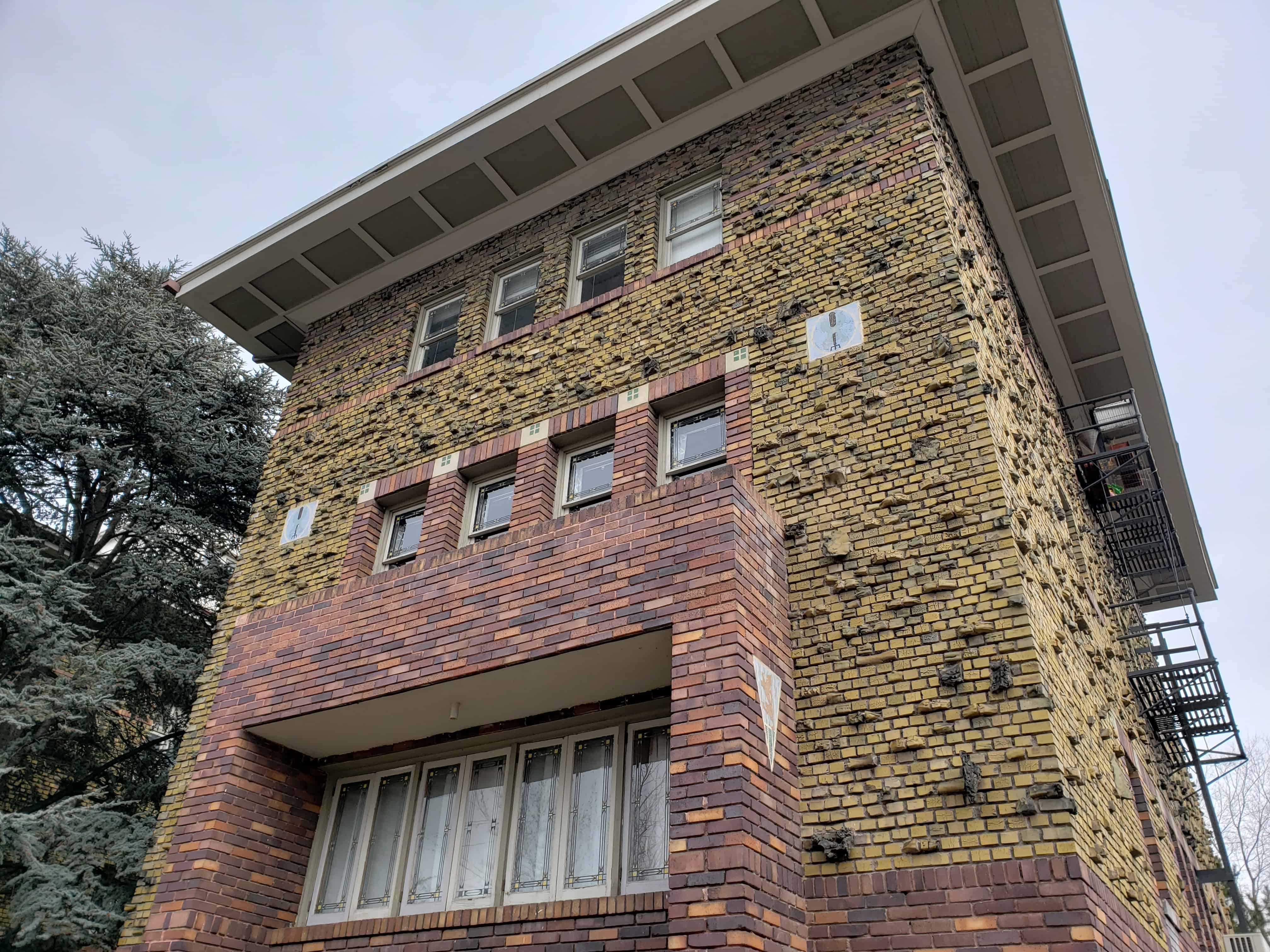 There are many interesting rocks protruding from the brick faces of the building, a resident told me that when they refaced the building and added those they had a problem with people rock climbing on the building.