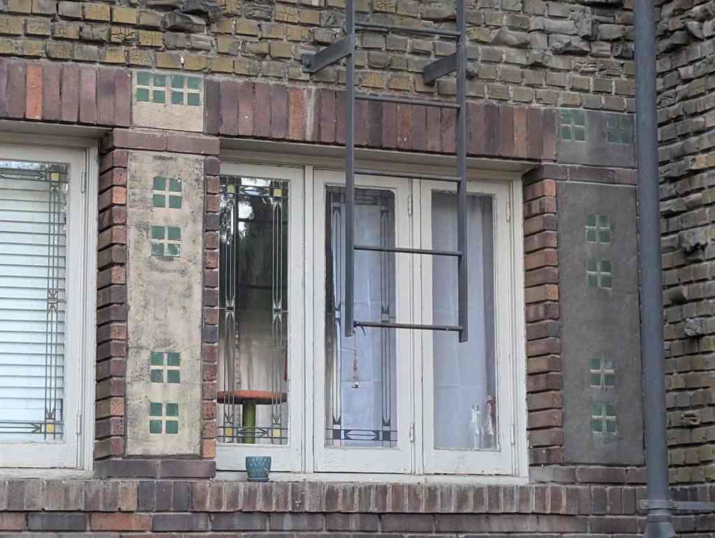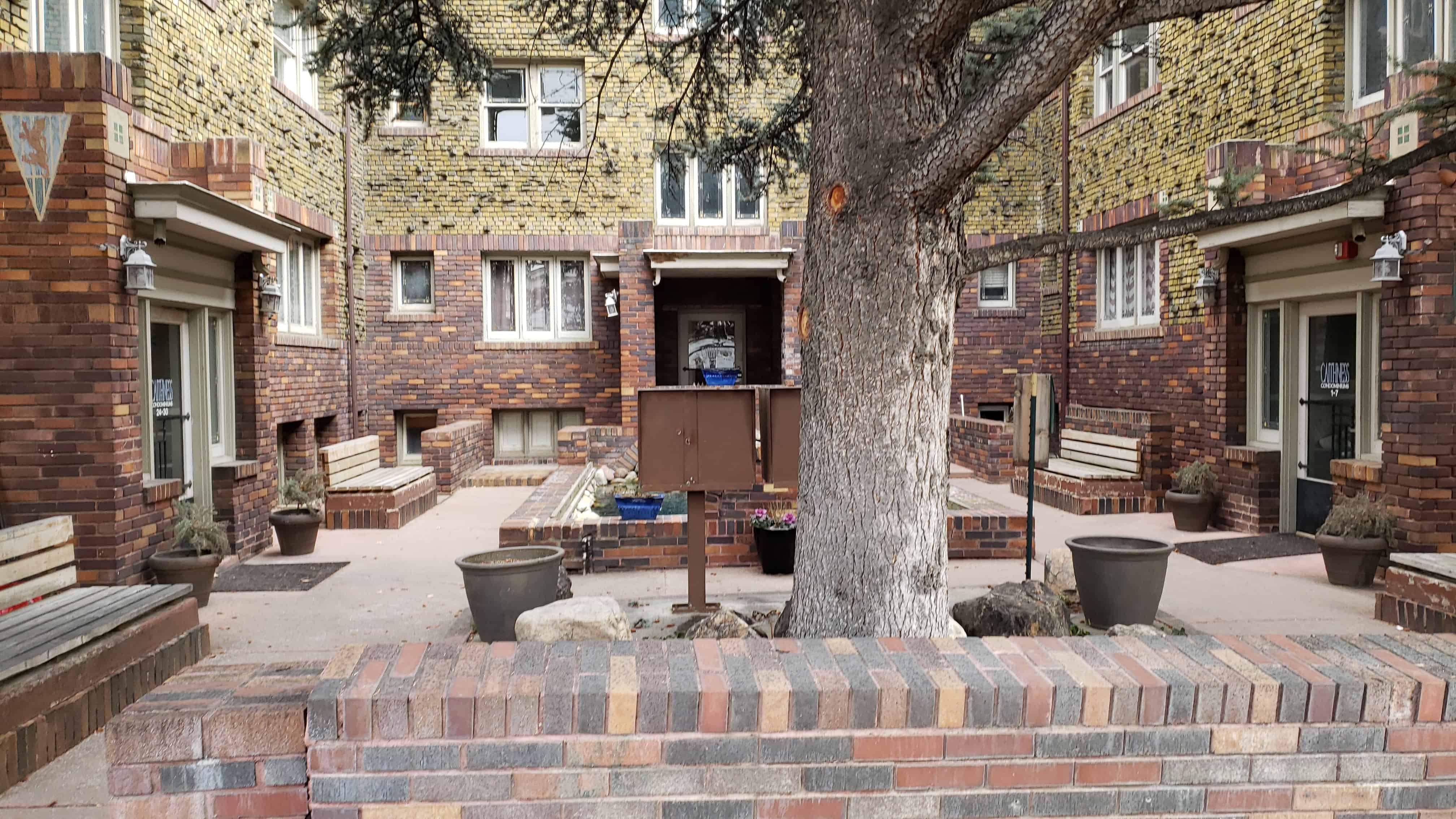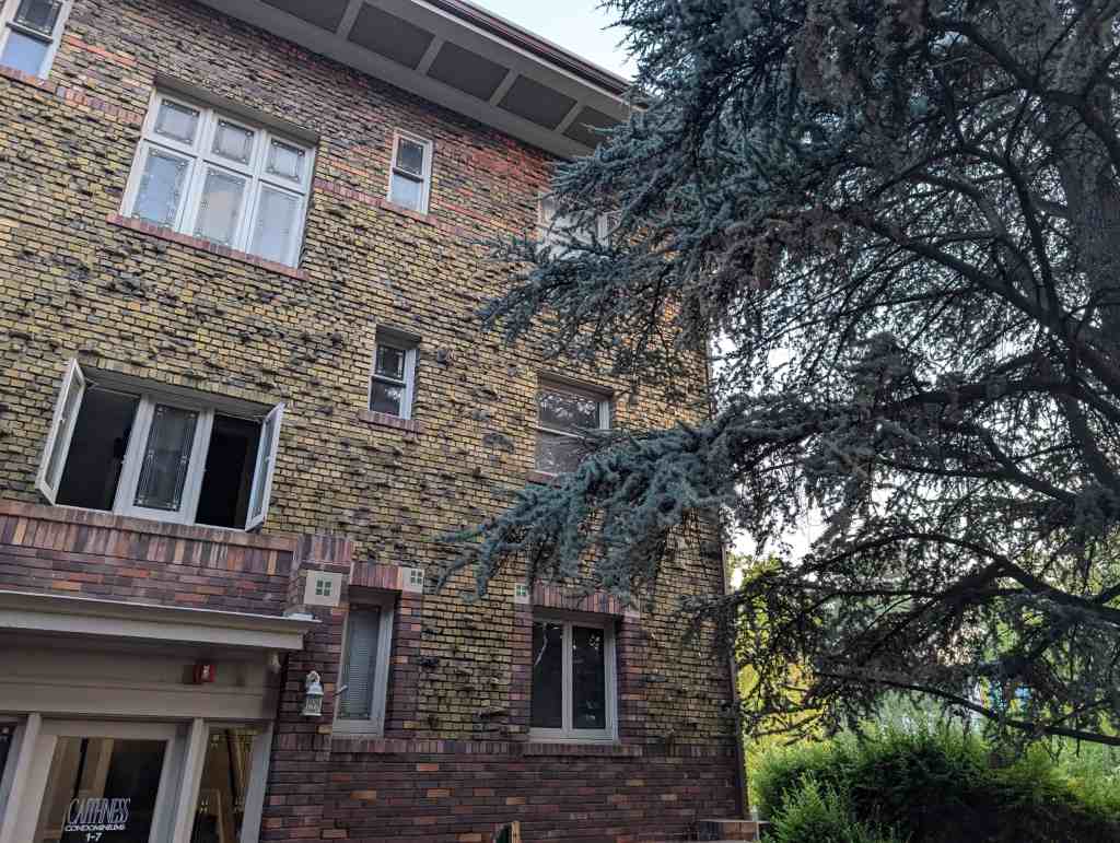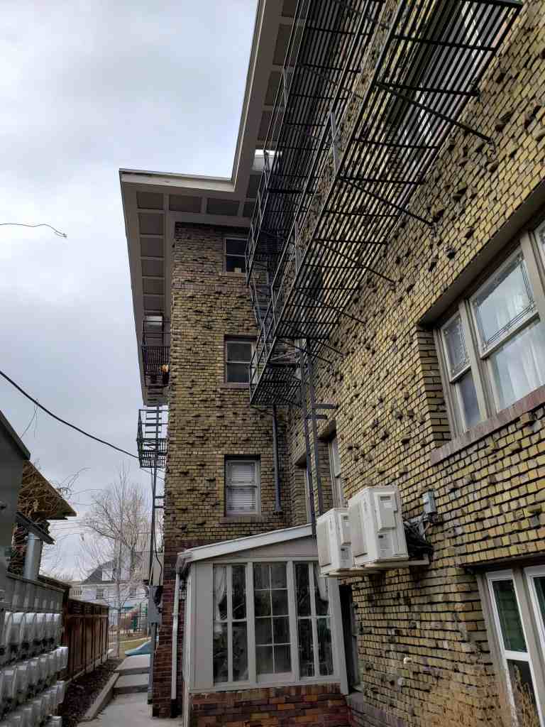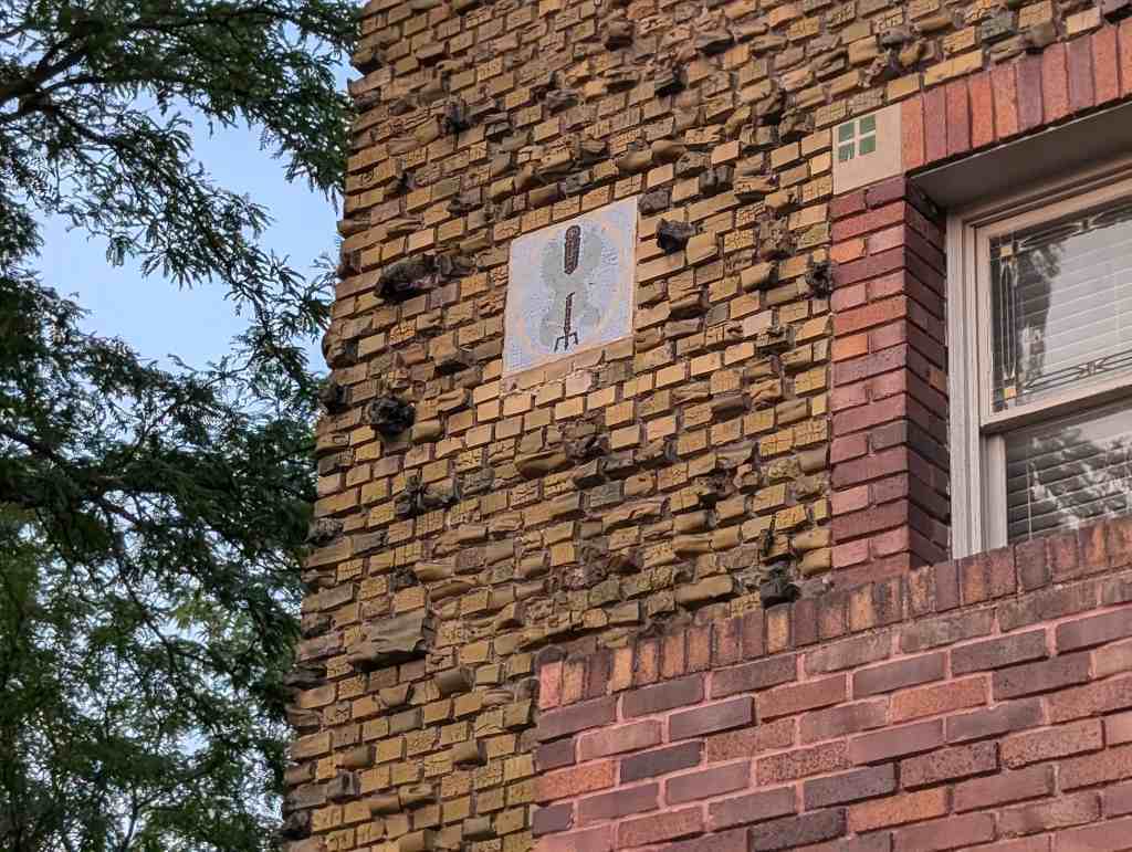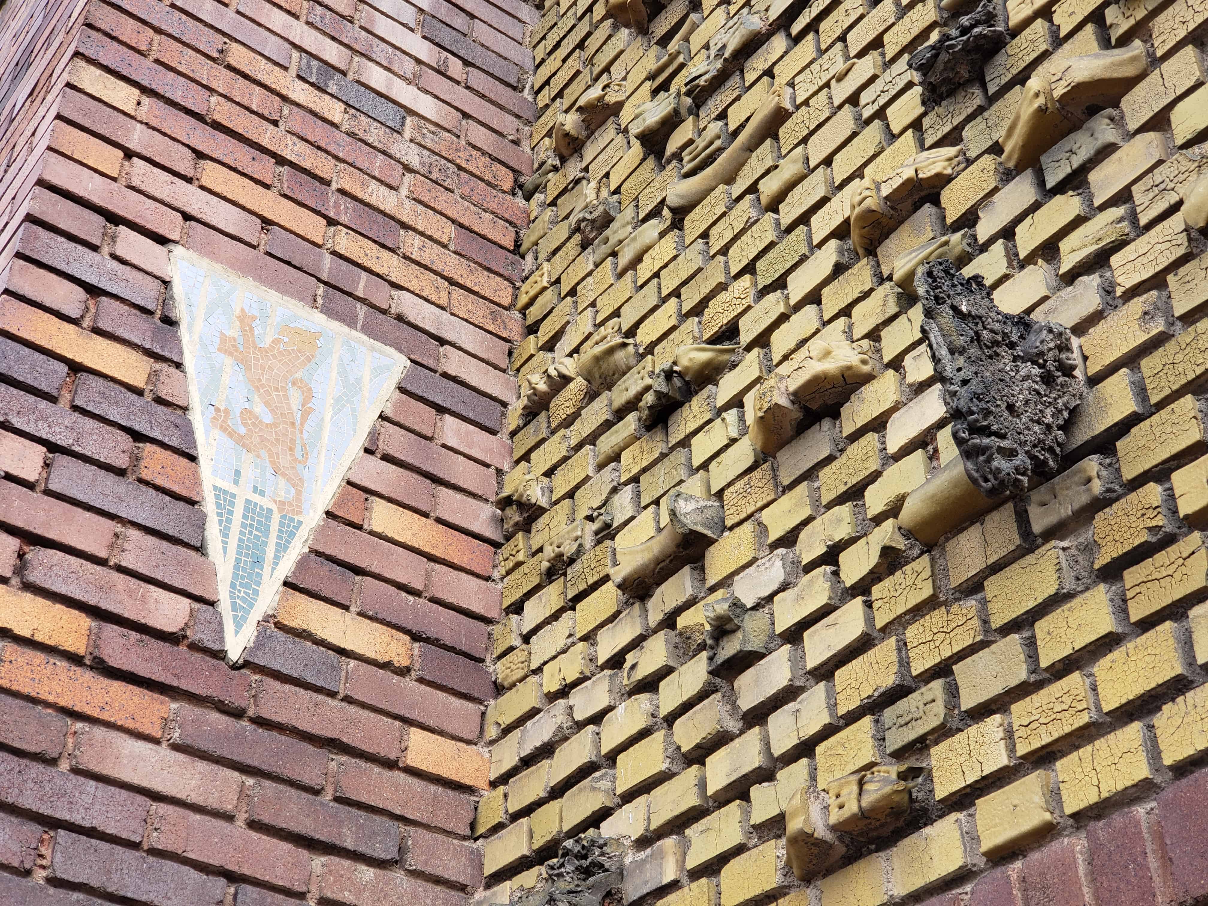 There are many interesting rocks protruding from the brick faces of the building, a resident told me that when they refaced the building and added those they had a problem with people rock climbing on the building.
