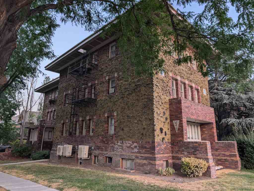 The Caithness Apartments is one of only two apartment buildings in Salt Lake City known to have been designed by Ware and Treganza, one of the most prolific and prominent architectural firms in Utah during the early twentieth century. They designed many other residential buildings – – primarily houses, but also a few smaller multi-family dwellings. The other Ware and Treganza designed apartment is the Smith Apartments located at 228 S 300 E. Both the Caithness and the Smith are walk-up U-court type apartments, though the central court of the Smith is much narrower than that of the Caithness.