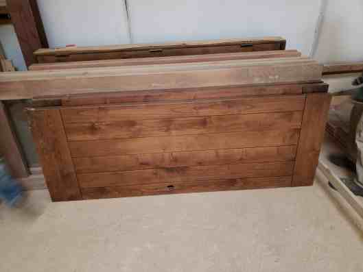 #10 – #25 are all the same door style, varying details and sizes – there are also about 40 more of these not listed here yet. They have vertical planks between horizontal top and bottom rails. They are knotty alder and finished a dark brown color. Bored for lock prep and hinged.