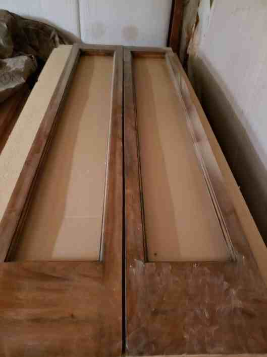 #26 and #27 – 14″ x 79″ full lite sidelites open for glass, stained. Wavy distressed, knotty alder.